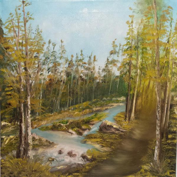 Mina målningar har en anknytning till ett lyriskt landskapsmåleri. Jag tänker mig landskapet som rum och kropp där jag vandrar i riktning inåt, utåt i okända terränger.